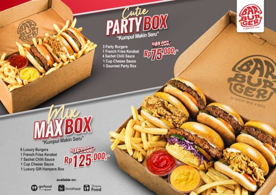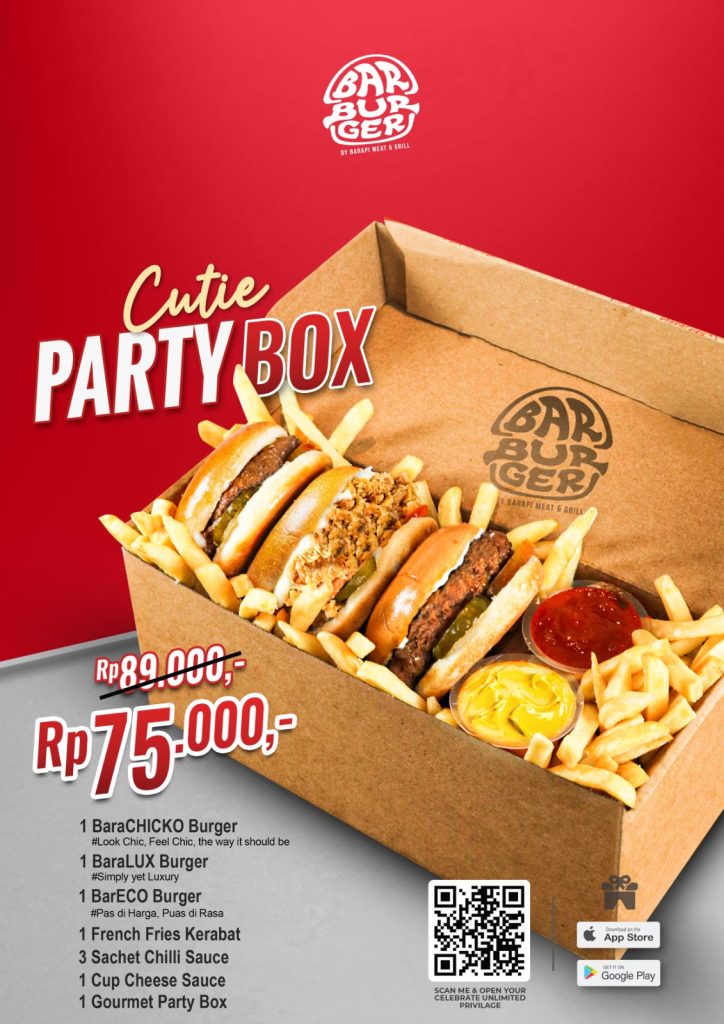 Merayakan momen spesial bersama orang-orang terkasih akan terasa lebih istimewa dengan hadirnya Cutie Party Box dari Barburger! Dengan Tagline “Paket hampers yg pastinya bikin kamu keren, dg isian 1BaraLUX Premium Beef Burger yg ga bakal ketinggalan trend, 1BaraCHICKO Chicken Burger yg enaknya konsisten, 1BarECO yg puasnya selalu paten, 1French Fries kerabat yg melengkapi komponen. Bawa ini ke tongkrongan pasti bikin kepo para netizen.“