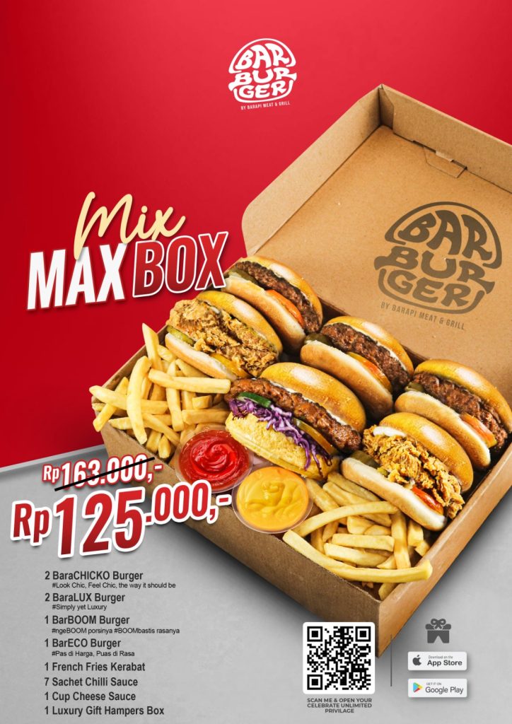 Bagi para pencinta burger dan kebersamaan, Barburger by Barapi kembali menghadirkan sebuah penawaran yang sulit ditolak: “Mix MAX BOX”. Sesuai namanya, kotak ini benar-benar memanjakan lidah dengan perpaduan berbagai burger andalan dan pendamping lezat yang siap disantap ramai-ramai. Mari kita intip lebih dekat apa saja kebahagiaan yang tersaji dalam satu kemasan praktis ini.