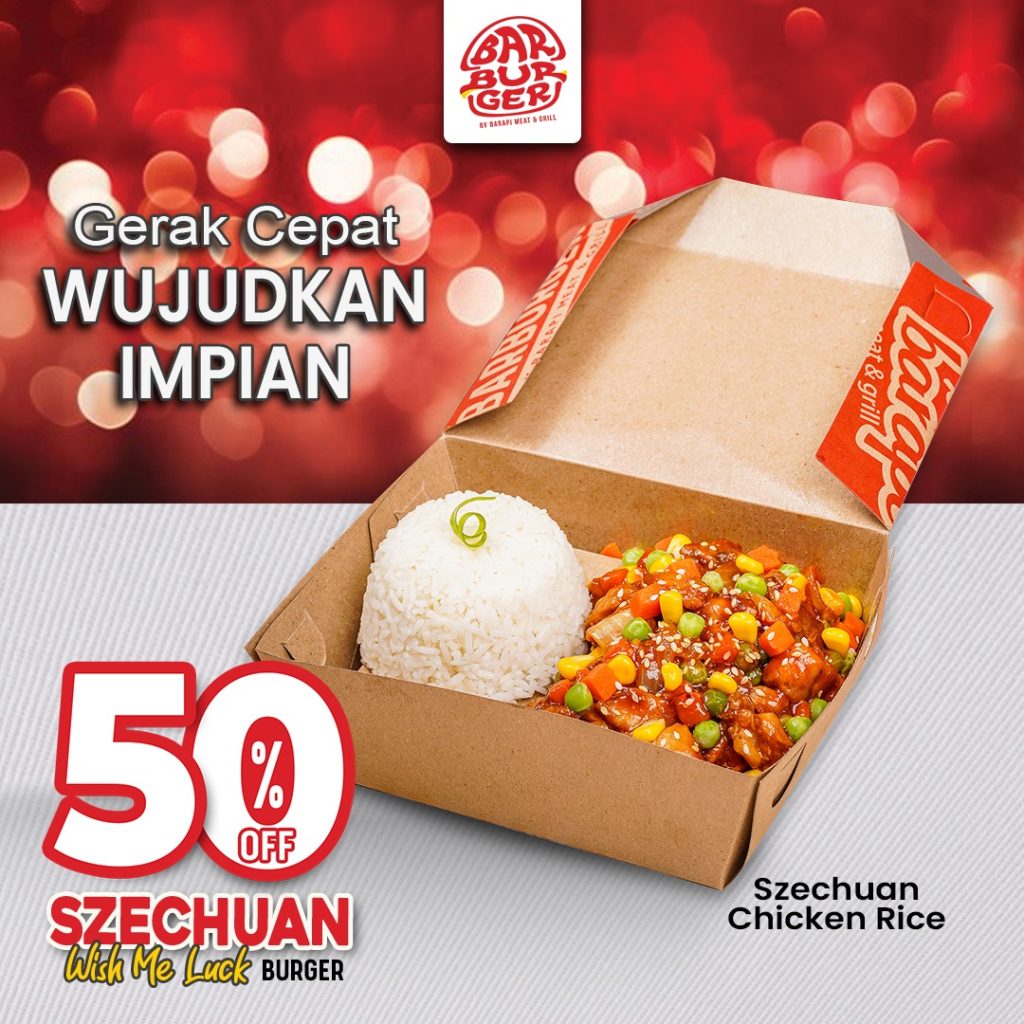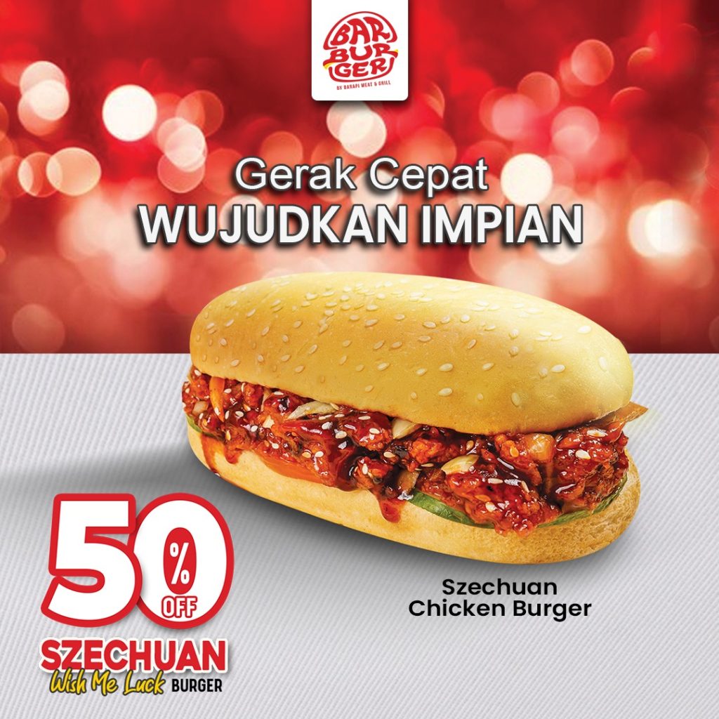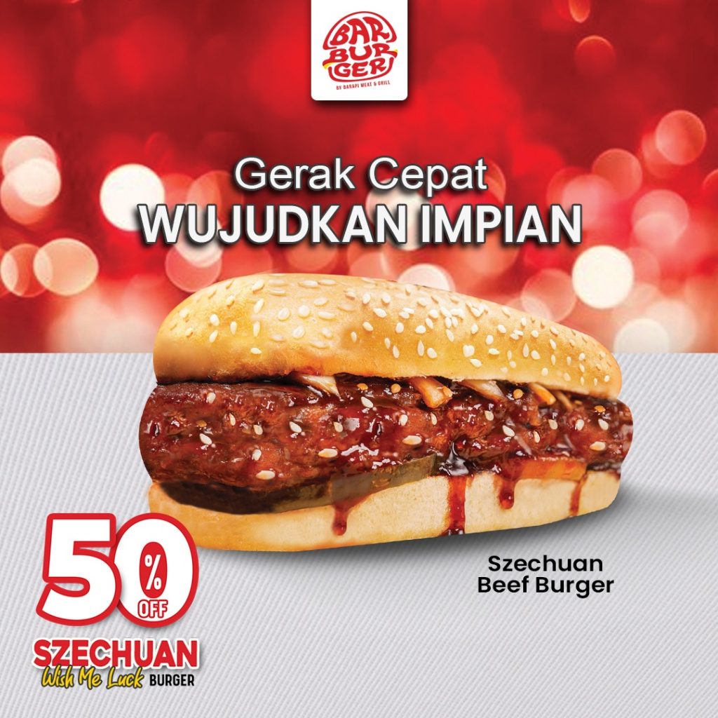 “Gerak Cepat Wujudkan Impian.” Burger eksklusif yg bikin pacarmu makin ekspresif. Dg roti gede panjang mirip gerbong kereta lokomotif, dipadu dg premium beef patty anti fiktif-fiktif, ditambah lumeran saus Szechuan gurih pedas manis, semanis kenangan mantan. Dijamin pacarmu yg agresif berubah jadi kondusif.