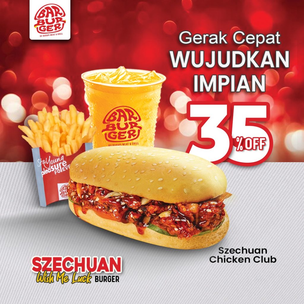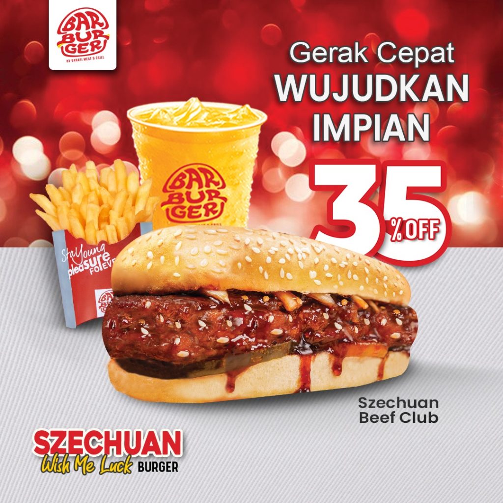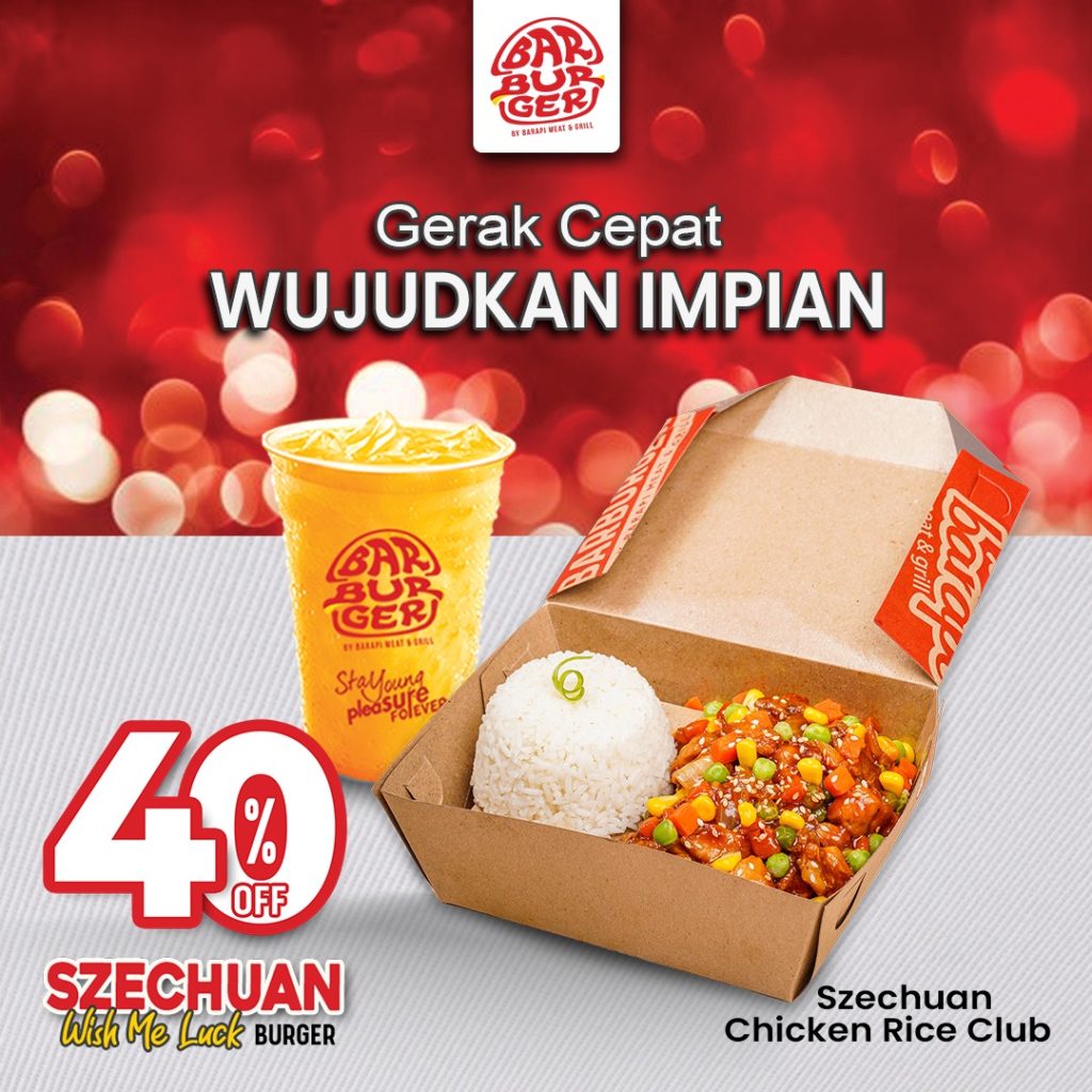 “Gerak Cepat Wujudkan Impian.” Burger eksklusif yg bikin pacarmu makin ekspresif. Dg roti gede panjang mirip gerbong kereta lokomotif, dipadu dg premium beef patty anti fiktif-fiktif, ditambah lumeran saus Szechuan gurih pedas manis, semanis kenangan mantan. Dijamin pacarmu yg agresif berubah jadi kondusif.